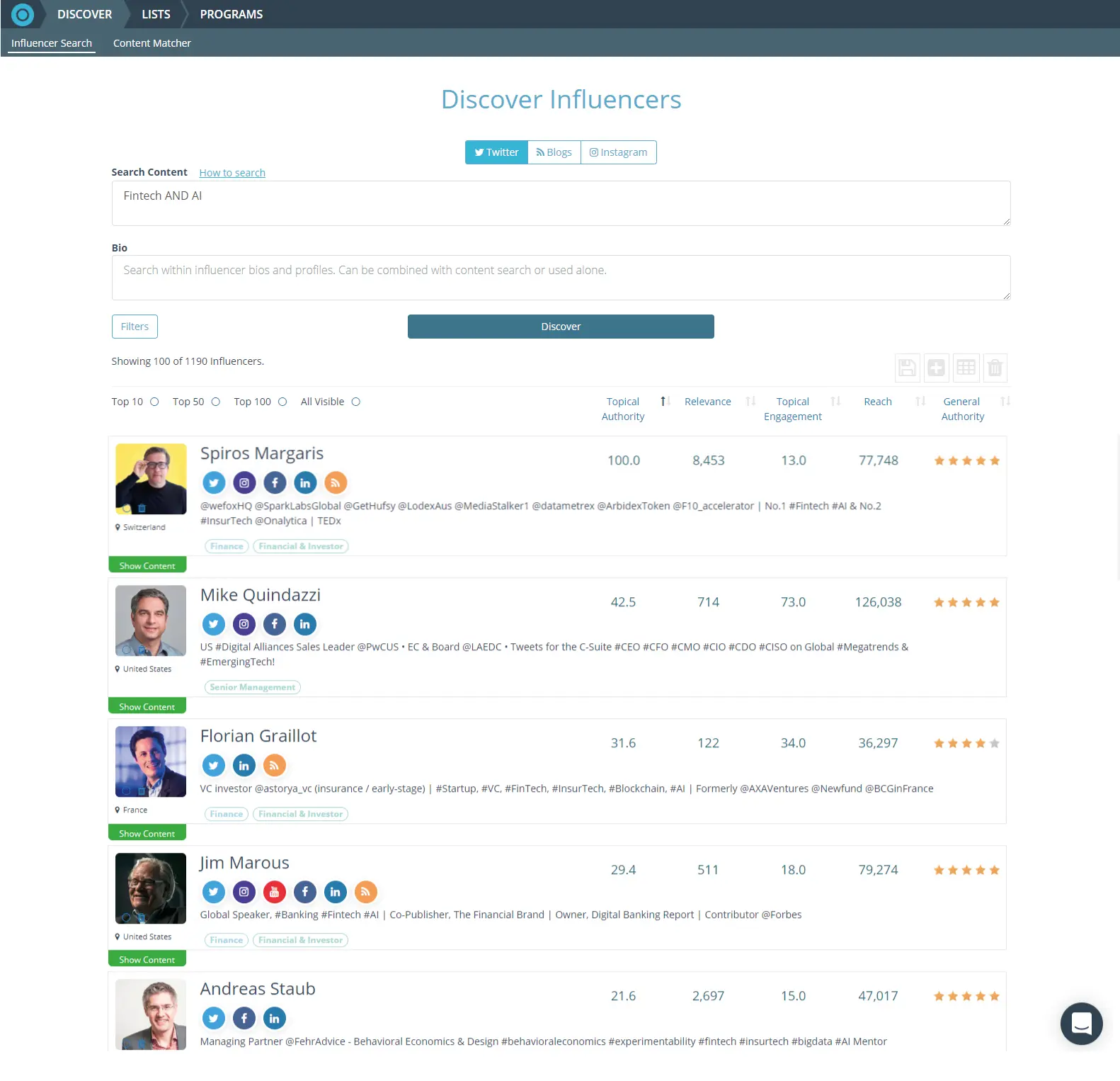 Customers can search for influencers in 3 ways. You can search by influencer topical focus, influencer description or using Onalytica’s patented content matcher feature.