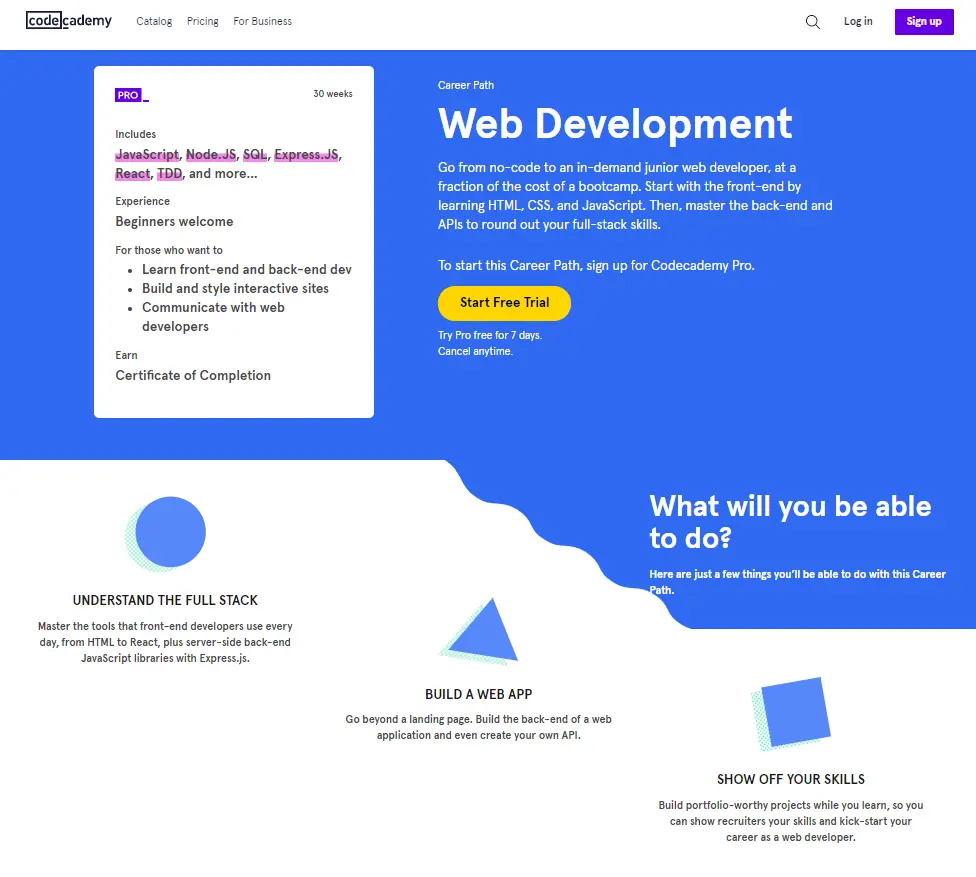 Code Academy is a popular online coding learning platform. The online course landing page for their web development program does an excellent job of identifying the most important elements of interest for prospective students. For example, take the big white box to the left that is a summary of what you get. It details the coding languages you’ll learn, looks at the experience you need to get started, what you will do in the course, and that your reward of the certificate of completion. This landing page also catches the eye with a combination of well-placed graphics and microcopy below the header. These immediately draw attention and reinforce the most important aspects learners will benefit from.
