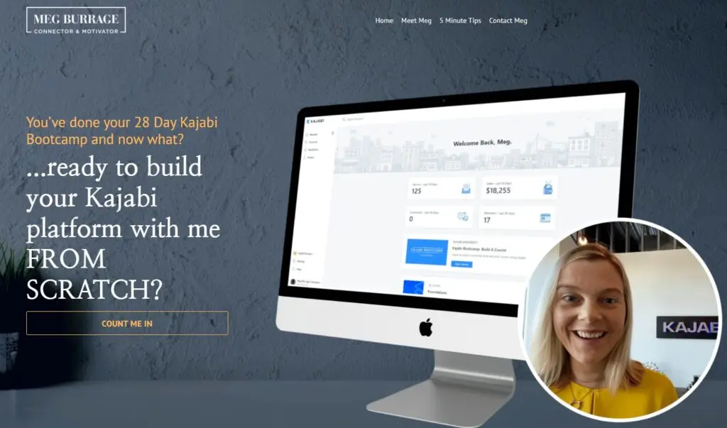 Kajabi is one of the most well-known and successful online course platforms available today. It's filled with tons of features and functionality to help you build and market your most successful online course possible. But there is one catch, building a course on Kajabi's platform can be a little complex. Meg Burrage identified this problem and created an online course for all Kajabi customers who have been through the platform's 28-day bootcamp, but still feel overwhelmed. Selling the idea of success to people who really feel like they've somewhat failed is no easy feat. But Burrage distills her message and gets it across effectively.