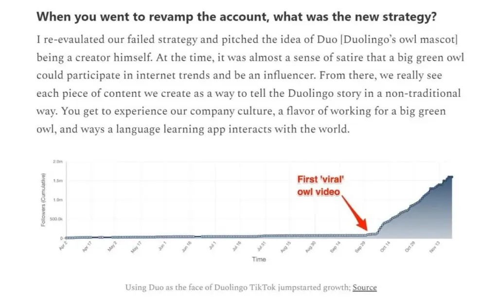 Parvez's initiative revitalized Duolingo's TikTok account, leveraging Duo's persona to create offbeat, meme-worthy, and irreverent content that resonated with users. This strategy tapped into cultural trends, showcased Duolingo's brand personality, and positioned Duo as an influencer, driving significant engagement and growth for the platform.