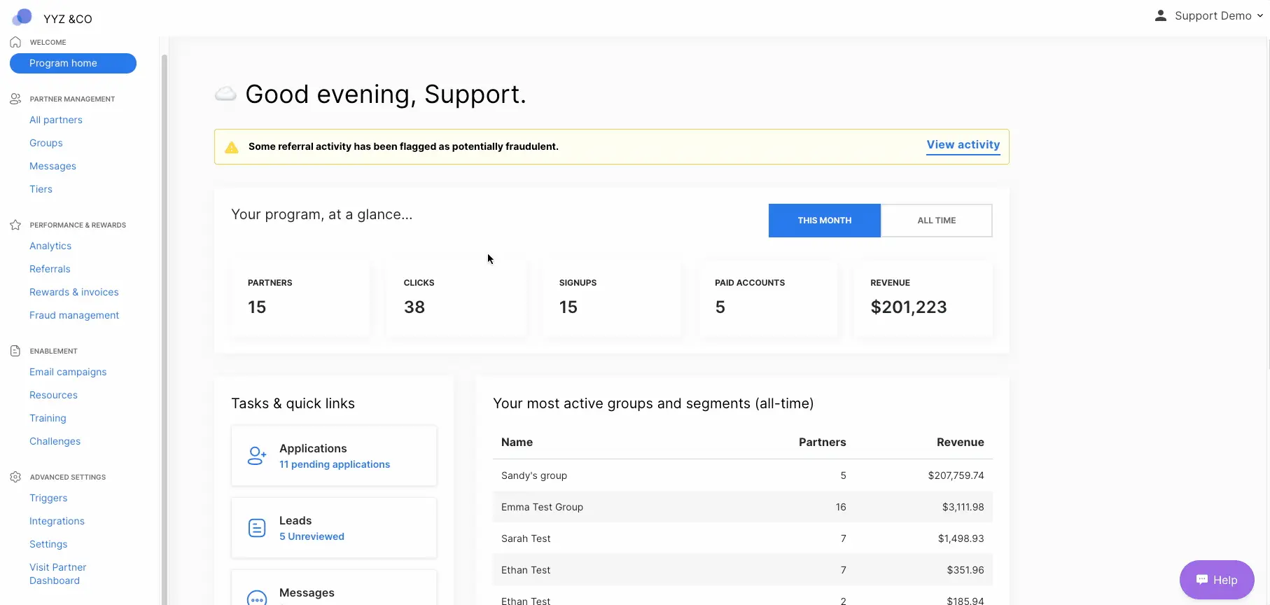 Because PartnerStack covers so many different types of partnership, setup can be a little complicated. Thanks to a well designed interface and clearly defined workflow, you won’t ever feel lost in the platform. But there’s a lot to cover in setting up your programs, and depending on how deep you go it could be time consuming and a bit complicated. The payoff to this upfront effort, though, is twofold. First, PartnerStack uses a very flexible system based on triggers you define—when X happens, take Y action. Being able to configure a wide variety of triggers during setup gets you the second benefit, which is just how smoothly everything runs when your programs live. It’s true automation.
