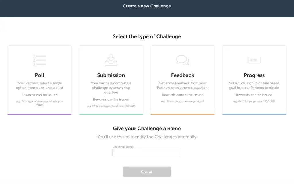 PartnerStack even lets you gamify your rewards with its “Challenges” feature. The obvious implementation of Challenges would be to set a goal of some kind—sales target, new customer signups, etc.—above and beyond the normal programs you’ve set and pay out when the goal is reached. But you can also use the goals to mobilize affiliates to market on your behalf. Maybe you offer an incentive for them to publish a blog post on their websites. Or have them answer a survey so you can gain valuable feedback on how to improve your partner programs.