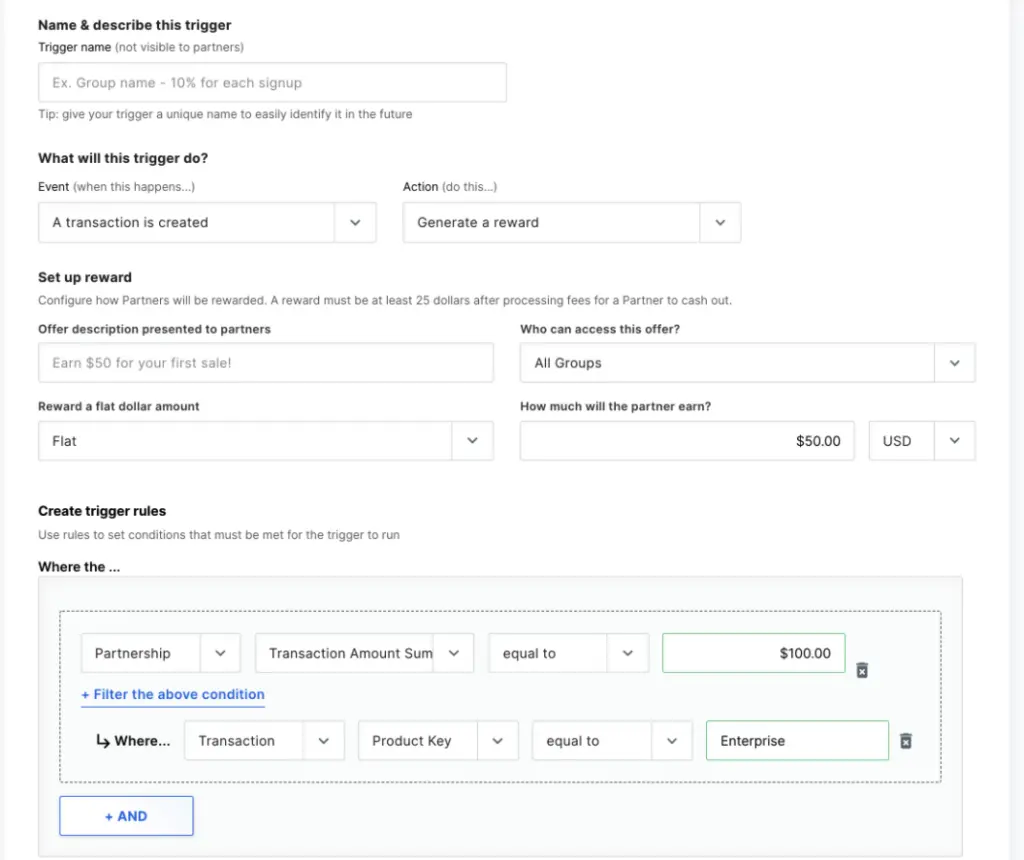 Because PartnerStack covers so many different types of partnership, setup can be a little complicated. Thanks to a well designed interface and clearly defined workflow, you won’t ever feel lost in the platform. But there’s a lot to cover in setting up your programs, and depending on how deep you go it could be time consuming and a bit complicated. The payoff to this upfront effort, though, is twofold. First, PartnerStack uses a very flexible system based on triggers you define—when X happens, take Y action. Being able to configure a wide variety of triggers during setup gets you the second benefit, which is just how smoothly everything runs when your programs live. It’s true automation.