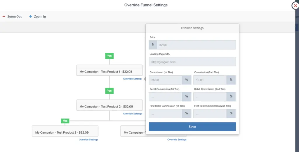 Managing affiliates is very straightforward, but also incredibly flexible. For each campaign you create, PayKickstart has you create a sales funnel for it. This isn’t like the sales funnel you normally see as a way to visualize customer acquisition. Instead this is a way to try and upsell customers with related products and services—this all happens at check out, according to a scripted workflow you define, and you can specify affiliate commissions for each product along the way. The way you define it applies to all affiliates in the campaign, but you can override these settings on an individual basis—you can even define different landing pages this way for different people in the same campaign.