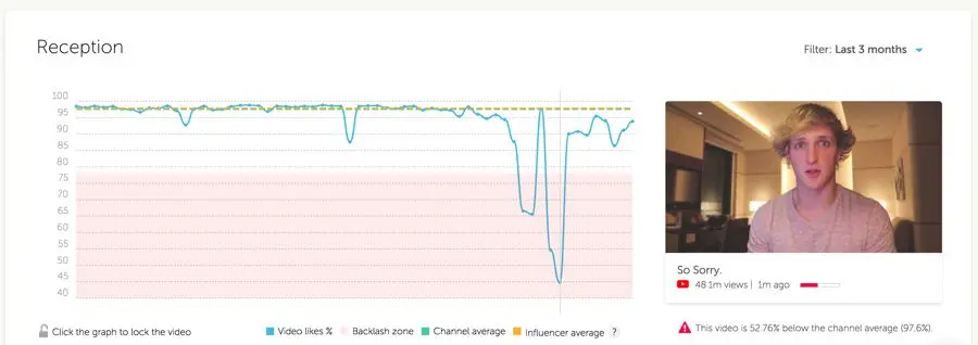Something else that matters? The person behind the influence. YouTubers don’t go through much a vetting process to become known or famous—if their content resonates with an audience, they get big. Brands are getting weary of finding out too late that an influencer they’ve signed is actually just racist, human garbage. Still, it’s hard to get a picture of who they are from a few pieces of content, so Peg works in the background parsing through all their content and assigning influencers a “Safety Score.” The overall score is based on several criteria—the higher the number, the more family friendly an influencer is. You can dig deeper than just the score though, and look through a list of “Naughty Words” they’ve said in videos (and the number of times they’ve said each. And you can see the trends of public sentiment over time for each influencer using Peg’s “Backlash Meter.” It’s an amazing tool that can show you whether an influencer has a history of upsetting or uplifting people. For each peak or valley that exists on the meter, you can drill down and see the content that preceded the response.