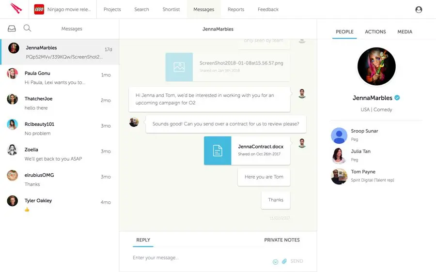 The depth and thoughtfulness of Peg’s discovery engine carries over into their management tools, as well. It’s a true collaborative platform, designed for large marketing teams and agencies. You can see this in the messaging feature—when brands and influencers communicate through the platform, the message window itself looks like a group chat on your iPhone. If members of the internal team want to send private messages back and forth (so the influencers or her representation can’t see it), it still all happens in the same window—you push a button to go into private mode, and the messaging area goes black to indicate that what you’re about to type is for internal eyes only. There’s no jumping back and forth between public and private threads to try and piece together information—everyone on the team has only one place to look to see all communications with an influencer for each project/campaign.