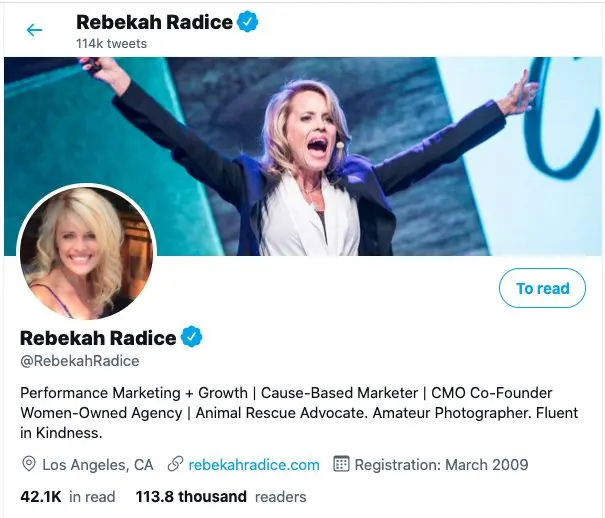Rebekah Radice, for instance, is an entrepreneur who’s successfully built a massive following on social media. She has optimised her Twitter bio with keywords that are relevant to her niche such as CMO, SaaS, Marketing, Branding, etc. And she shares highly valuable information that her followers may appreciate.