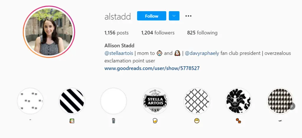 Similarly, on Instagram, she keeps her bio short with her base and her professional role. She makes it fun by describing herself as an alumnus of restaurant chains. She then calls herself a “mom to” and tags the profile of her dog, Franklin, a cockapoo.