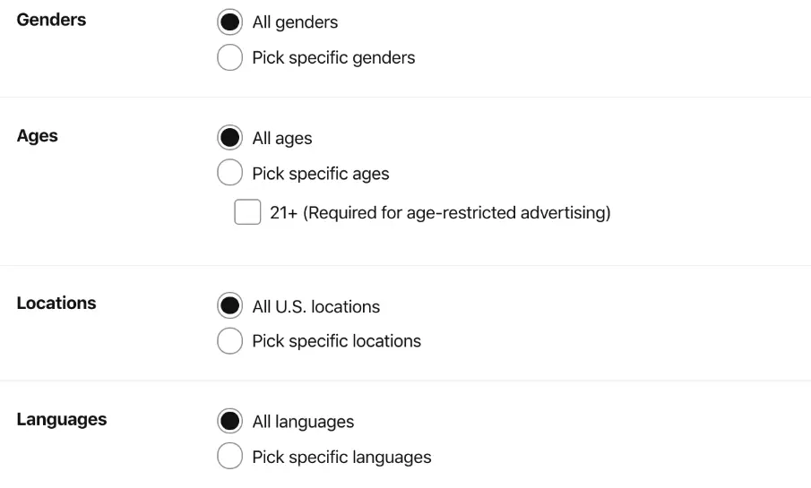If you have done prior research into who your target audience is and have made customer personas, then you can easily fill in these details. Each ad that you create should be targeted to a specific target customer segment. If you have multiple target segments with different demographic profiles, then you need to create different ads for each.