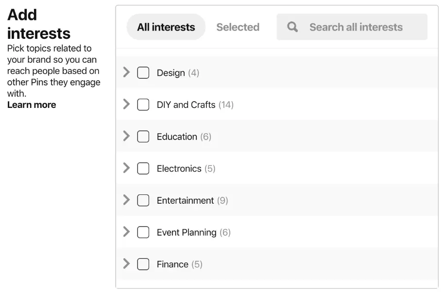 Here are some of the interest categories offered by Pinterest to target the right audience for your ads:
