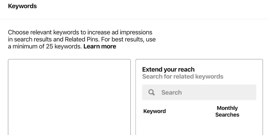 Let’s say your target keyword is “blue shoes”. If a person searches for “blue shoes” on Pinterest, then your ad will be eligible to be shown to that person. However, if the person types anything else, like “blue converse shoes” or “cheap blue shoes”, then they won’t see your ads.