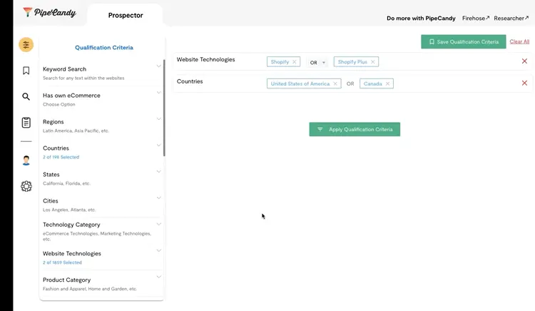 You can also add a lot of criteria around technology, too. If you’re a sales rep for Mailchimp, you don’t need to waste your time with companies who are already using it; instead, you can set your sights on those who’ve been using Klaviyo, Aweber, and other competitors. This kind of tech search covers just about anything an e-commerce company might use—affiliate networks, ad exchanges, content management systems, you name it.