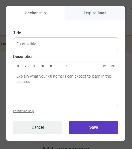 Creating content for a course varies across platforms. Some allow video and various file types to be uploaded. Others offer lessons with dedicated pages, accept video, text, and various file format uploads. Podia fits into the latter group. To start building out your content, you'll need to add a section. Sections are created with titles and descriptions, and also include the option to enable drip settings.