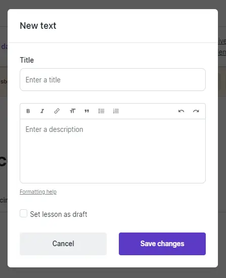 To add text, all you need do is add a title and a description. Again, you can set the lesson as a draft before clicking on the Save changes button.