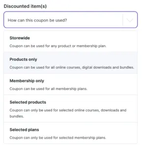 Coupons are a smart incentive tool. They give your audience the opportunity to get in on a great deal at a discounted rate. Podia makes coupons available through a tab at the top navigation menu. They're also easy to create. Click on the New Coupon button, add a coupon code, and choose from one of five ways in which a coupon will be used.