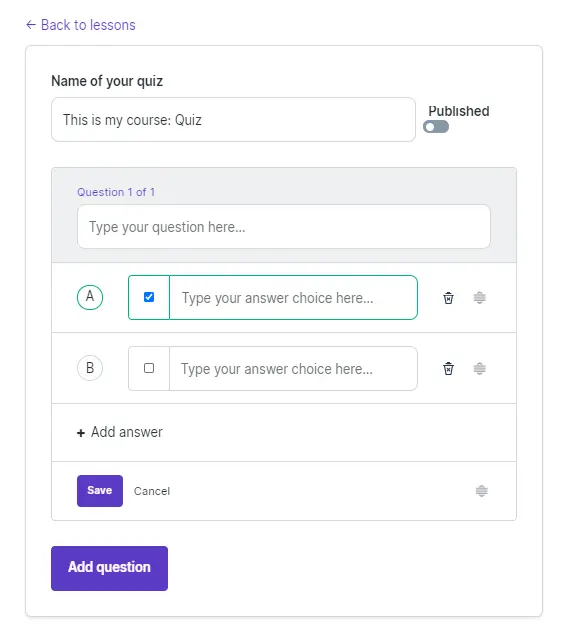 To populate your quiz click on the Edit button. Quizzes are multiple-choice and as you build yours out, you'll add questions and answers. Once completed, you'll need to select the toggle button to publish your quiz. While the option to quiz students is a win, We’ve seen other platforms offer multiple testing options. On Udemy, for example, students can complete assignments, while Skillshare offers projects.