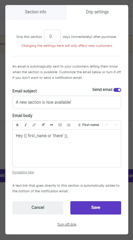 Distributing your course in a drip format may not seem like a must-have, but it's a feature that can prove valuable depending on the course and content. Podia makes drip settings available for each section you create, hinting at the fact that a section is a lesson.