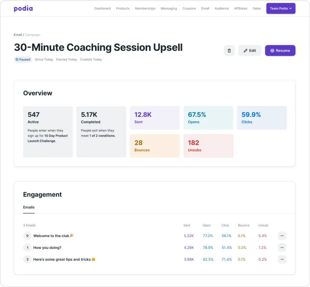 Podia also provides an overview of your metrics. You can tell how many active or converted subscribers you have, how many completed one of your conditions, number of emails sent, your open and click rates, number of bounces, and how many subscribers you gained. These metrics are broken down into even more for each email.