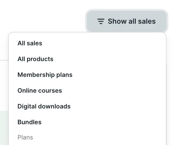 Your Sales tab also comes with a collection of filters. You see all sales, product sales, membership plan sales, online courses, digital downloads, and bundles views. And if you'd like, you can export your sales history in the form of a CSV file.