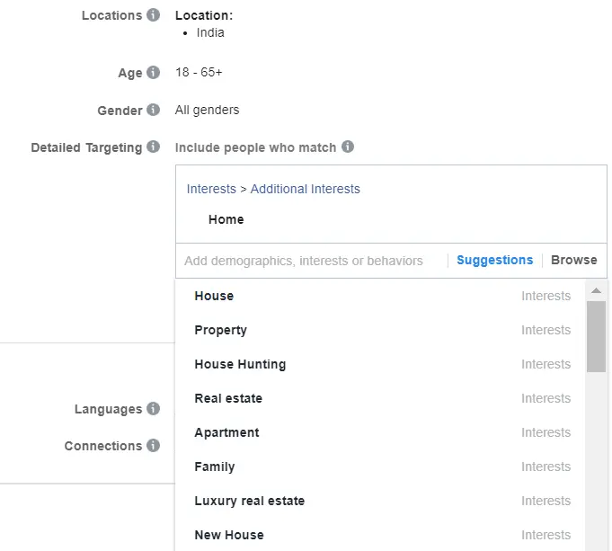 The final layer should be of behavioral targeting filters to show your ads only to people who might be interested in buying or renting a property. You can use interest-based targeting for this.