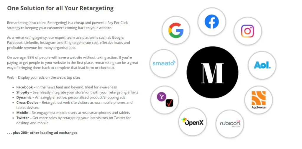 Below is an overview of Munro Agency's comprehensive remarketing services, a testament to their strategic prowess in cross-platform engagement. They stand out for their extensive reach across a myriad of platforms, including Facebook, Shopify, and Twitter, as well as their adeptness in navigating both cross-device and mobile landscapes.