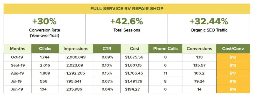 That's exactly what Thrive Internet Marketing Agency did for a full-service RV repair shop in the Dallas/Fort Worth area. The client was in need of a website redesign to capture visitors who wouldn't convert. Thrive analyzed various website elements, like call-to-action buttons and the overall landing page design. By optimizing these elements, Thrive managed to increase conversion rates by 30%.