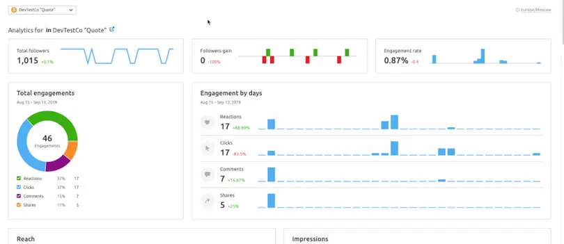 The analytics tool included with SEMrush is incredibly impressive; there’s so much more than just the basic Reach/Likes/Comments/Shares metrics that other platforms regard as the only important things to track. And, rather than just provide a blanket array of data across all channels, the information you get changes depending on the platform and the kind of data each will provide.For example, your Instagram analytics can show you how your audience interacted with each post, from an obvious action like responding to a CTA to the less obvious trackable data point showing how many people viewed your profile after seeing a post.LinkedIn analytics give you background on your audience’s professional demographics, like the size of the companies they work for and what their job function is.