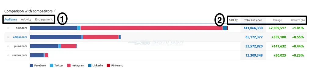 SEMrush offers an excellent analytics tool. It offers much more than simply the basic Reach, Likes, Comments and Shares metrics. The information that you get also changes depending on the platform and the type of data that each platform will provide. It also offers you a tracking tool to keep track of the social media activity of your competitors which can come in handy.