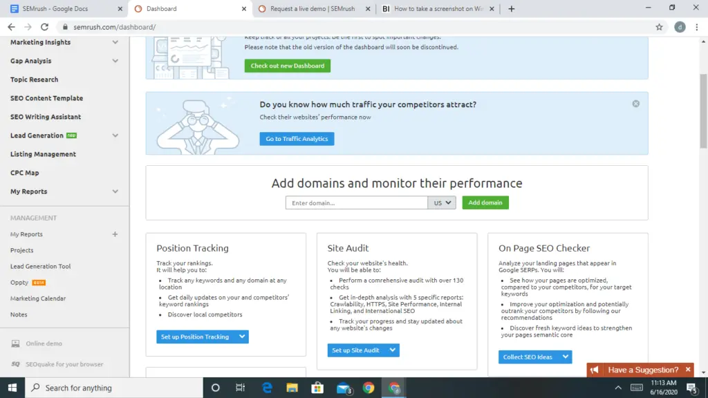 The good news about SEMrush and its all-in-one approach is that users will not be left wanting for features (mostly, but more on that later). The bad news is that upon first logging in, you’ve got a dizzying array of choices of where to start—and almost no guidance on where or how to proceed. If you scroll down on the Dashboard page, you can find—in small grey letters on a lighter grey background—a link to book an online demo. If you don’t want to contact the company and subject yourself to the inevitable torrent of sales emails after, there is also a 12-minute Overview video which you’re shown after you’ve confirmed your email address during the signup process.The overall point here being: getting started with SEMrush feels a little overwhelming and the guidance needs to be more, well, guided.