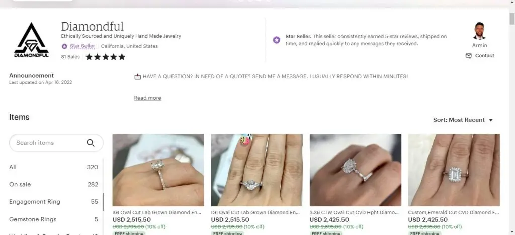 Below is an example. Diamondful sells diamond jewelry on Etsy. One look at its store and you can tell it sells diamond-related items. From its name to its logo, all the elements have a uniform tone.