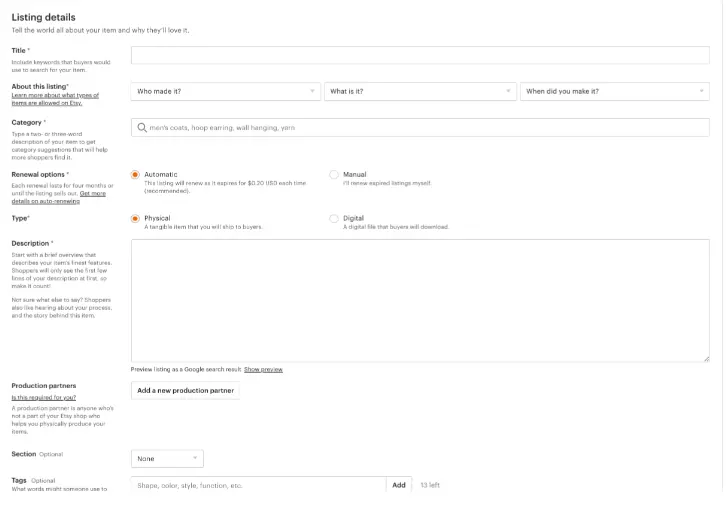Item descriptions can have a maximum of 13 tags. Make the most of all of them. Focus on long-tail keywords and be technical when creating tags because each tag has a 20-character limit.