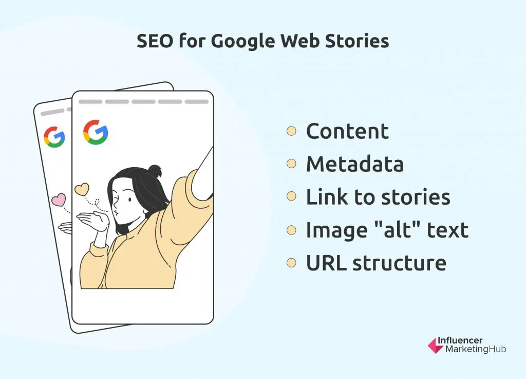 Web Stories must be optimized like any type of content so Google can find and index them. All SEO practices that apply to regular web pages are also used in Web Stories. Creators must keep the following in mind: