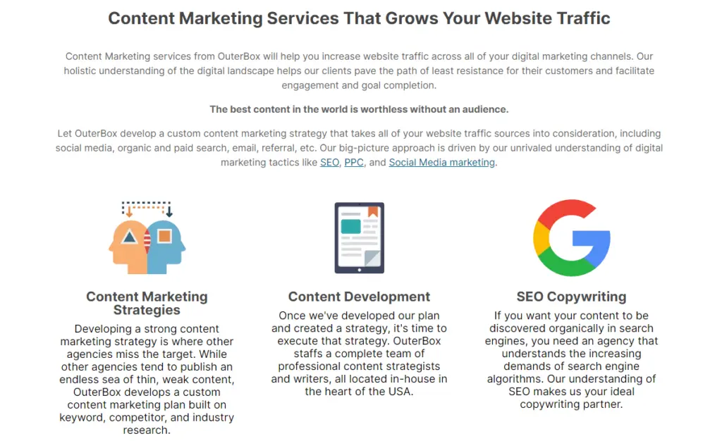 A perfect example of an agency that offers expert content marketing services is OuterBox. As shown in the image below, you can see that their content strategy approach is deeply rooted in an understanding of digital marketing tactics and their impact on growing your website traffic.