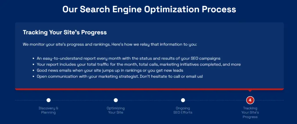 Again, choose an agency that is open regarding its SEO process, much like TheeDigital does. In the image below, you can see how reporting and analytics tie into the overall SEO strategy, with the agency providing easy-to-read reports for you to gauge the effectiveness of their services.