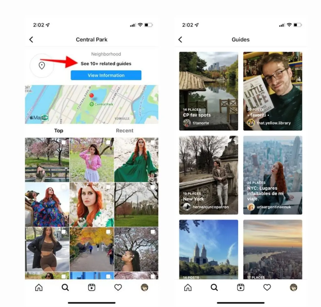 Another way to make use of location tags for Instagram SEO is by creating an Instagram Place Guide. Place Guides show up at the top of the search results when users search for certain location tags on the platform. When users click on the option to “See related guides,” they can come across the Guide that you’ve created for that particular location.