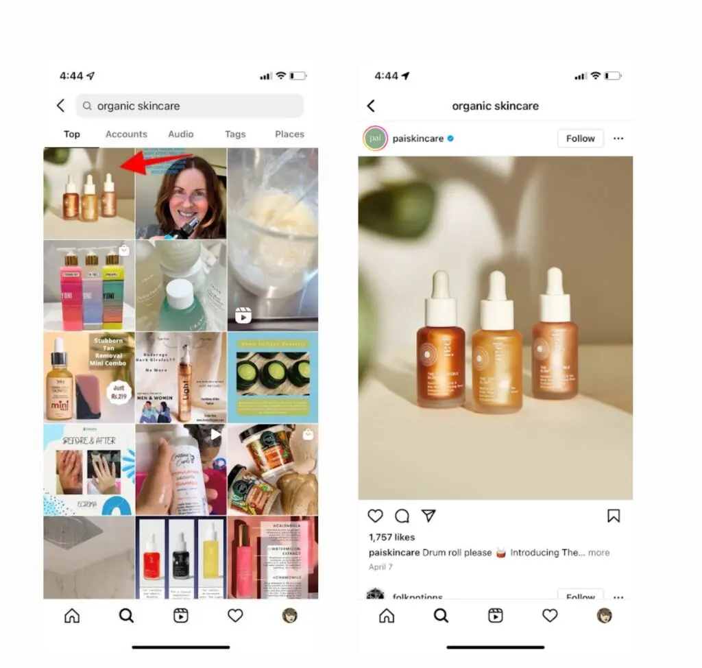 With Pai Skincare, their post ranks prominently on the Explore page for the search term “organic skincare.” This is because the brand consistently creates content related to organic skincare products.