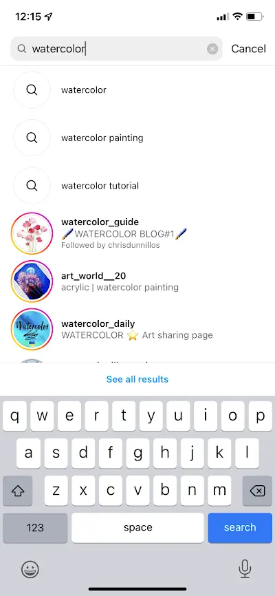 The Instagram algorithm first looks at whether the username, bio, caption, hashtag, and location match the query that a user enters into the search bar. So if you search for the term “watercolor,” some of the top account suggestions will have “watercolor” in their username, profile name, and/or bio.