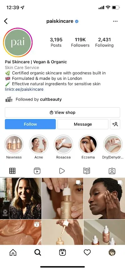 If it’s not possible to change your Instagram username for brand reasons, you can still find a way to use the primary keyword in your profile name. See for instance, how Pai Skincare uses keywords like “vegan” and “organic” in their profile name.