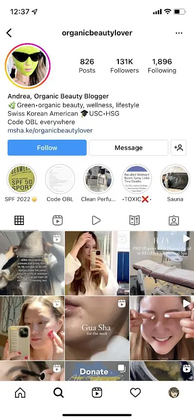Start by optimizing your profile with keywords that are relevant to your niche. You could use a primary keyword in your name and username. This is much easier for content creators as they have the freedom to play around with their Instagram handle. For example, the following content creator uses @organicbeautylover as her username and includes “Organic Beauty Blogger” in her profile name, incorporating the keyword “organic beauty” in both instances.