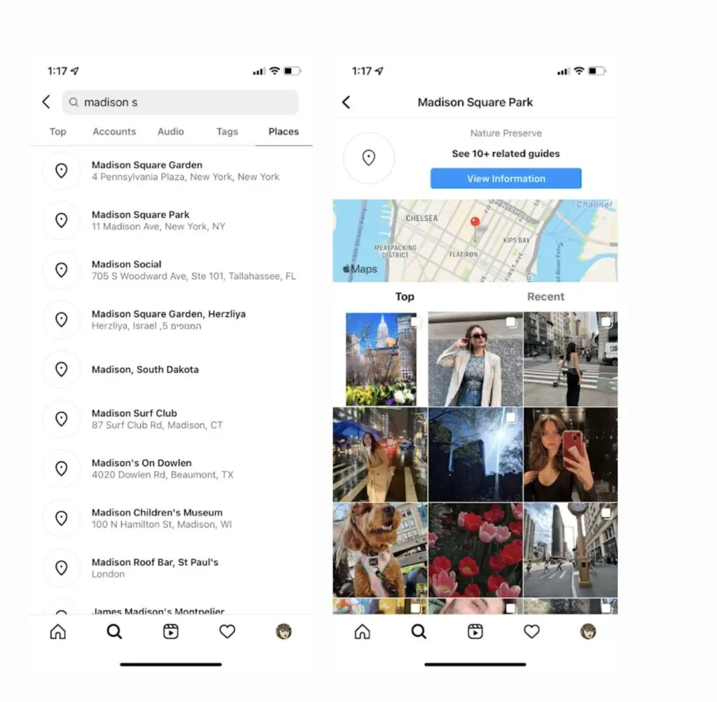 Instagram gives users the option to search for content from a specific location. Under the “Places” tab, people can find content tagged using the geotag for that location. That means using location tags in your posts is a great way to get your content discovered on Instagram. It allows people searching for content around the location to find your post and engage with it.