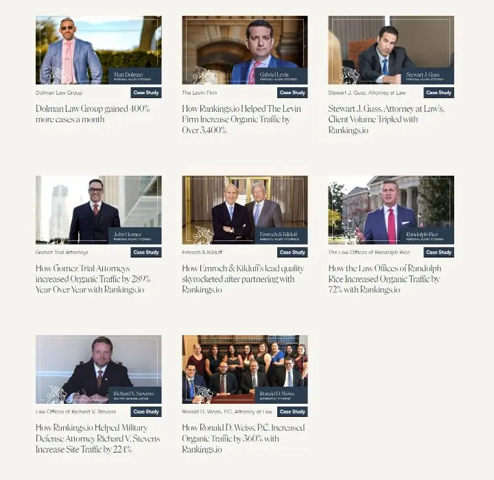 To illustrate, let's use Rankings as an example again. Here is how they provide concrete evidence of their success through a comprehensive collection of case studies, showcasing the diverse range of projects they've undertaken for various law firms: