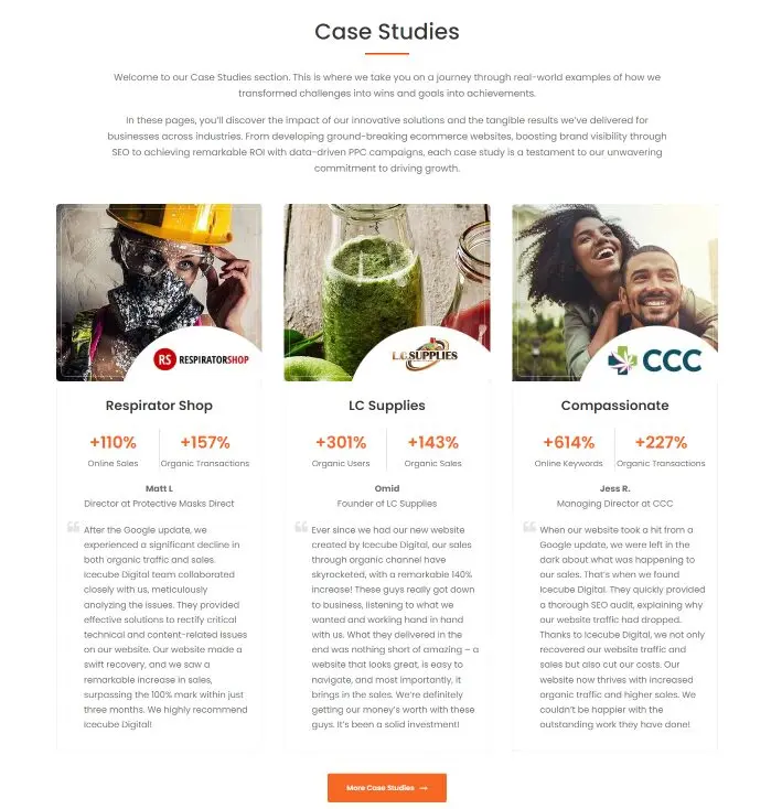A strong portfolio reflects an agency's competency and experience. Don't just look at the number of clients or projects; delve into specific case studies that showcase measurable improvements in SEO metrics, such as increased organic traffic, higher conversion rates, and improved SERP rankings. Additionally, consider the agency's experience with businesses similar to yours in size, industry, or target audience to gauge their ability to understand and meet your unique needs. Notably, IceCube Digital stands out for its commitment to transparency and detail in showcasing its Magento SEO expertise. For every Magento SEO project undertaken, they provide comprehensive case studies, clearly outlining each client's unique challenges, the tailored solutions implemented, and the measurable results achieved.