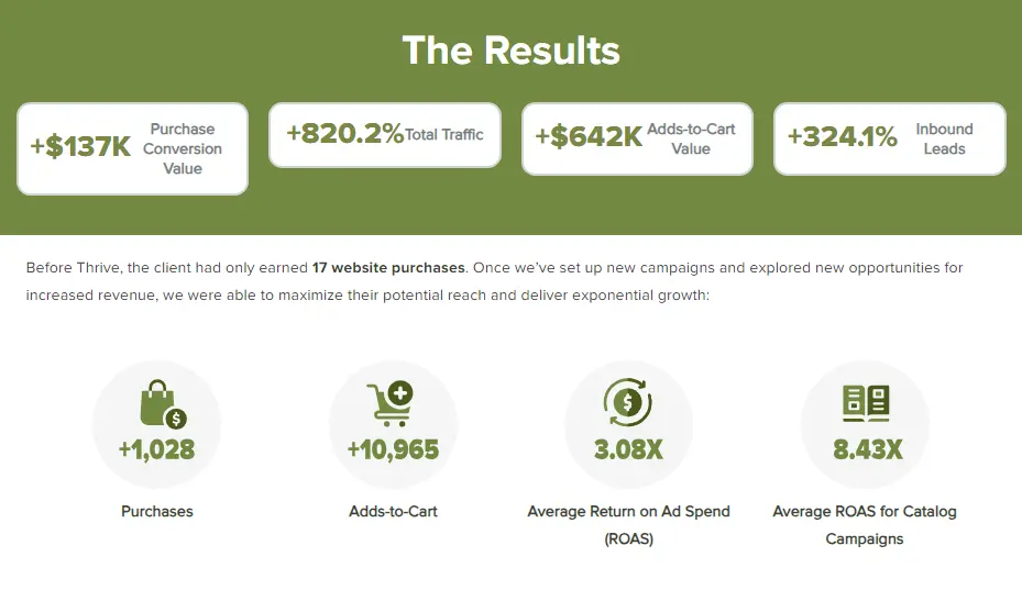 Let's examine a case study by Thrive. A sneaker and apparel store in Florida hired Thrive to improve their organic search traffic, leads, and sales. Prior to the enlistment, they had a total of 17 website purchases. Through a combination of SMM, PPC, and SEO, Thrive managed to increase their website traffic by 820%, sales by 324%, and keyword rankings in the top 5 by 50%.