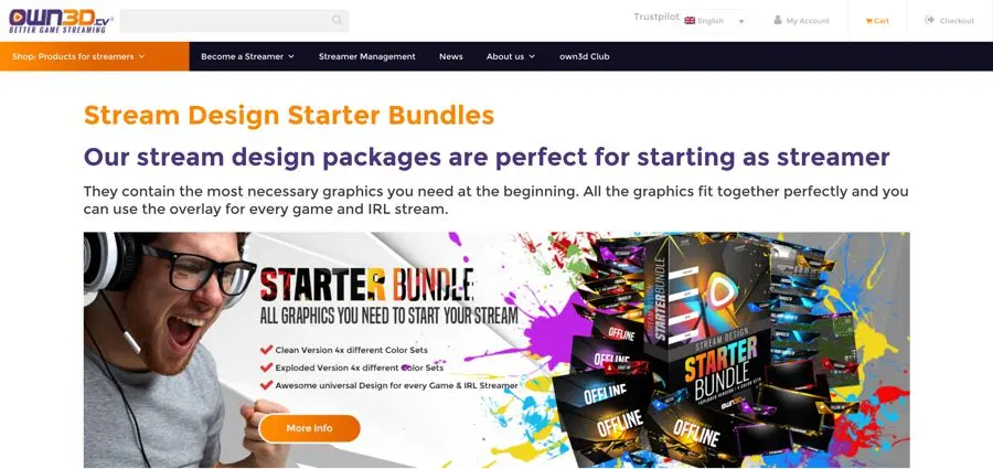 Also at own3d.tv, you can purchase graphics, overlays, and animations to include in your stream. They offer a wide variety of animations and static graphics for Twitch alerts, game specific overlays, transitions, intermission banners, and much more. Many of these can be purchased on their own, but you get the most bang for your buck with their Master Bundles. These include everything you need within a specific theme to make your live streams pop.