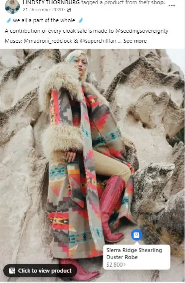 Take a look at the following shoppable Facebook post from Lindsey Thornburg, for example. You can see how the robe, which is the main focus of the post, is styled with other items that complement the product. And the color of the background allows the product to shine through so that the main focus is on the robe.