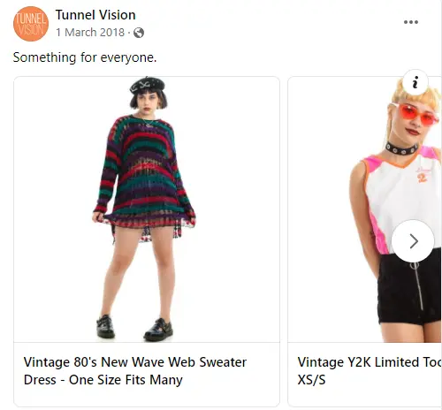 Tunnel Vision uses Facebook to regularly share carousel posts displaying the various clothing items in their store. Their goal is to show how they have something for everyone or the different must-haves that customers should consider buying.