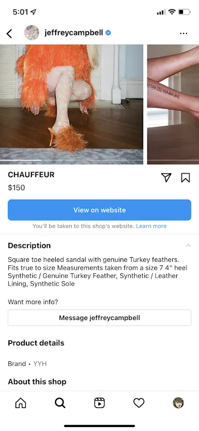 Since you want people to make a purchase directly after seeing your content, you should give them the information they need to finalize their decision. This involves providing all essential details that they may need such as the material used, the heel height, the color options, and the price. For example, the shoppable Instagram posts from Jeffrey Campbell contain some of the most crucial details that a customer might need before deciding to purchase a pair of shoes.