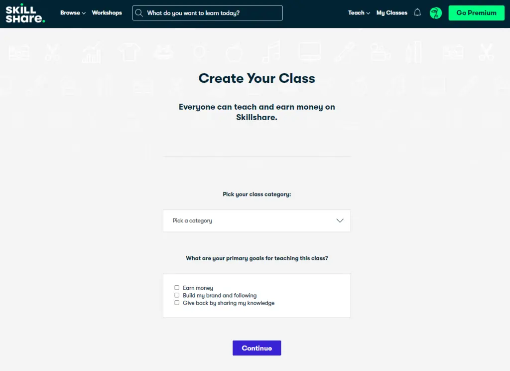 The first thing you'll see after signing up is a quick class creation questionnaire. You'll need to pick a category for your class and then tell Skillshare what your primary goal is for teaching this class. There are three options available which are to earn money, build a brand and following, or give back by sharing knowledge.