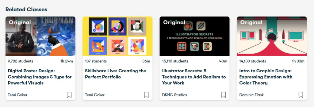 A collection of related classes appears at the bottom of your class page. You'll see cards that indicate the number of students who have taken a class, how long it is, the class title, and the name of the teacher.