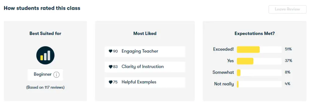 The Reviews section in Skillshare offers a little more than most platforms. It gives you an idea of who the classes are for according to its difficulty level, shows you what people like most about a class, and whether their expectations were met.